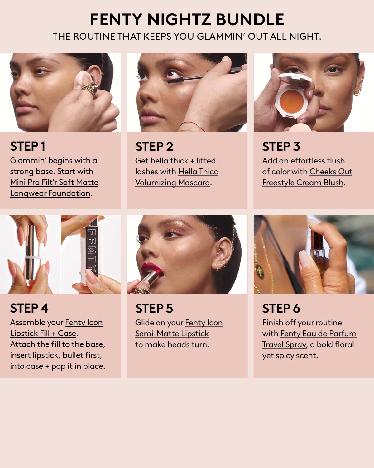 Go in on the glam, fam! This set has you covered for a smooth base and bold lashes, lips + cheeks so you’re ready for a night out. Finish off with Rihanna’s signature scent and be the center of attention wherever you’re headed next.